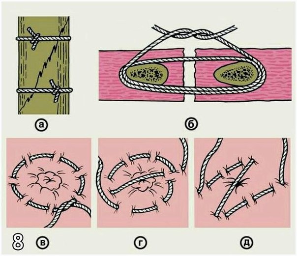При ушивании эвентрации либо при глубочайших ранах используют съемные 8-образные швы по Спасокукоцкому (б, в).